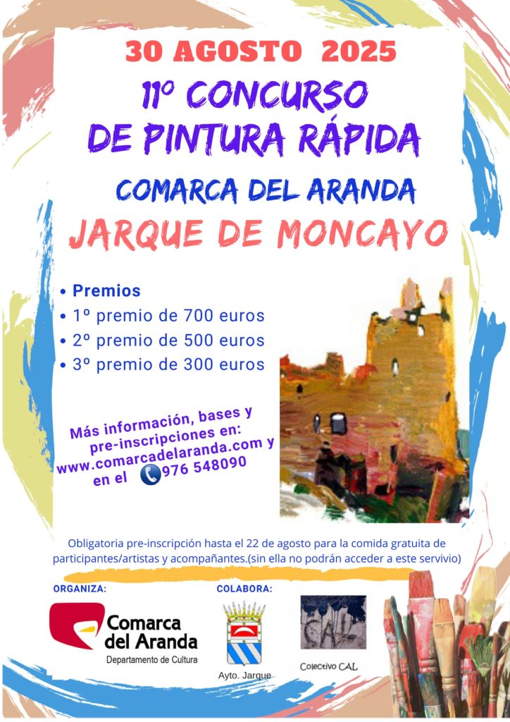 El 30 de agosto se celebrará el 11º Concurso de pintura rápida de la Comarca del Aranda en Jarque del Moncayo con premios de 700 euros al ganador, 500 euros al segundo puesto y 300 euros al tercero. Puedes consultar las bases aquí y preinscribirte descargándote el formulario en PDF o el documento de word, y enviarlo a informacion@comarcadelaranda.com o también puedes hacerlo a través del teléfono 976 548 090. La preinscripción estará abierta hasta el 22 de agosto y es obligatoria para acceder a la comida gratuita que se ofrecerá a los artistas participantes y a sus acompañantes.  ¡ Te esperamos !